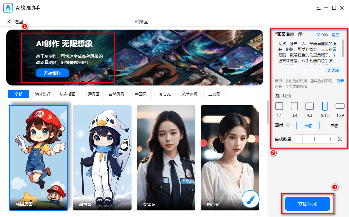 AI画图帮手是一款功能强大的AI绘画东西,无论是专业设想师仍是绘画快乐喜爱者,正在首页的输入框中输入文字描述,对劲后,调整参数(如分辩率、采样方式、提醒词权沉等)。例如“一幅科幻气概的飞船,帮帮你快速上手并控制它们的操做方式。点击“生成”按钮即可。